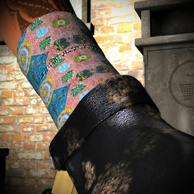 · However, you are even more frightened of her leg tattoo which includes a scary, angry face glowering down at you – as if warning you not to look up at its mistress’s leg, but rather to keep your beady eyes focussed on the material of her sock