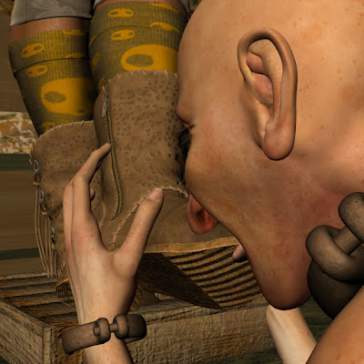 Oh, and don’t imagine even for one minute that the young woman’s happy conversation has anything to do with the footslave at her booted feet. She is scarcely even aware of his humble presence, as evidenced by the way she remains engrossed in her phone as she eventually walks away without acknowledging him, but with her boot-toes suitably darkened by his elderly footslave saliva.