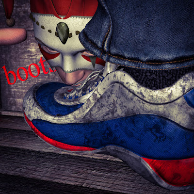 It’s late evening, and here we observe two Gynarchy girls putting to shame a prisoner-slave in the public stocks in the town square. Note how they have decked his face with a humiliating and demeaning, rubbery footfool mask, making him look suitably sad, and have also given him a jester’s ‘crown’ (i.e. a footfool’s cap) to finish off his humble look. Moreover, they have placed a mocking marionette, with a little red whip, on the top of the stocks by way of a further act of ridicule towards the slave.