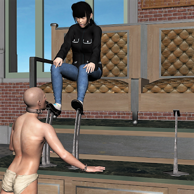 Of course, what I hadbeen gearing up to ask the beautiful, Chinee customer-mistress was as to the origins of the dirt and dust stains on her otherwise pristine white socks, but she is clearly in no mood to discuss her socks with a public footslave. And so, I am left to speculate. Looks to me like the dirt marks come from an earlier, strappier pair of shoes she must have been wearing with these same white socks?