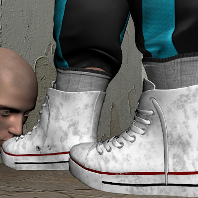 The thin girl is enjoying watching her fat friend using me have her feet kissed. And rightly so – for the fat girl is a true Gynarchy goddess who deserves to be worshipped by a lowly, public servant like me. Not only are her white canvas, high-top sneakers dirty; and not only is she wearing thick, grey socks with a fetching black trim; but the tiniest slither of her soft, white ankleskin is just visible beneath the hem of her black and blue tracksuit bottoms thanks to her arrogantly outstretched leg. Truly I am an honoured slave to be so close to such Gynarchy goddesshood, and to taste where a superb fat girl like this has been walking.