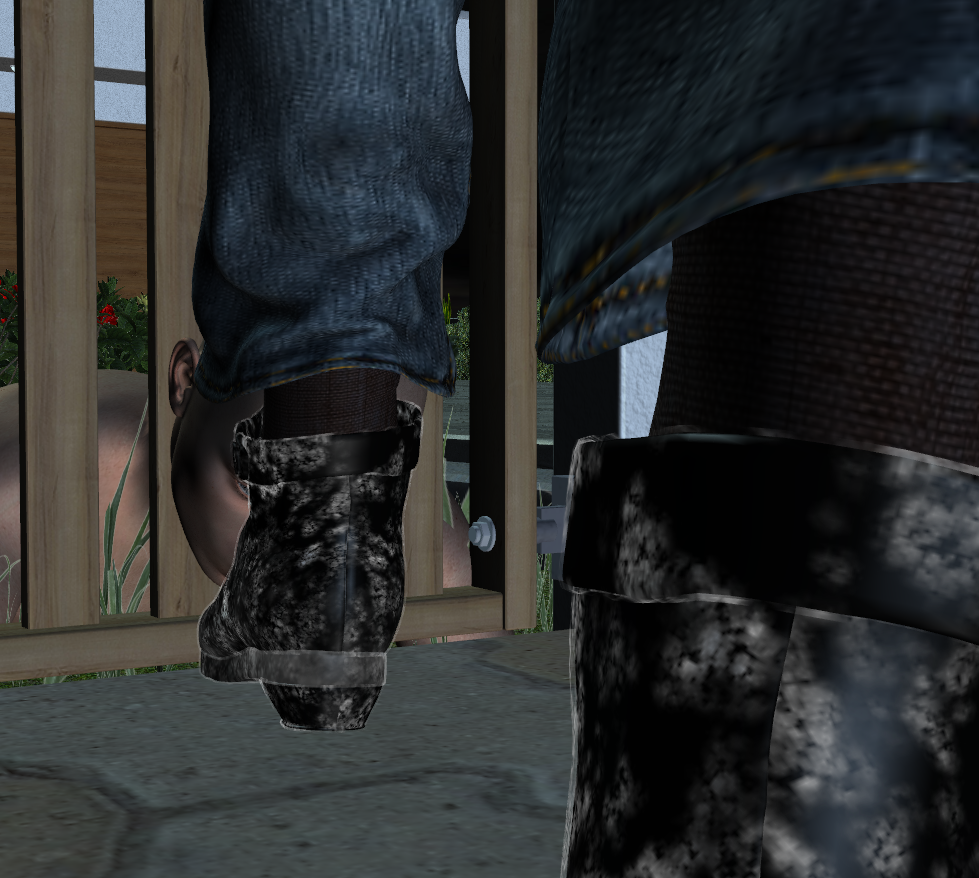 I bow my head below her dark brown sock in order that my lowly lips might touch her dirty, black bootleather |