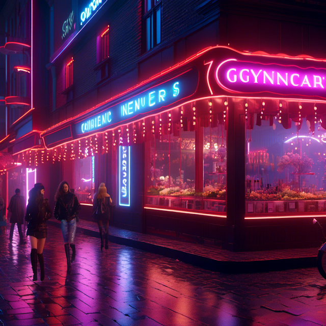 Glimpses of nightlife on a rainy night in Barbaria, the capital city of the Gynarchy