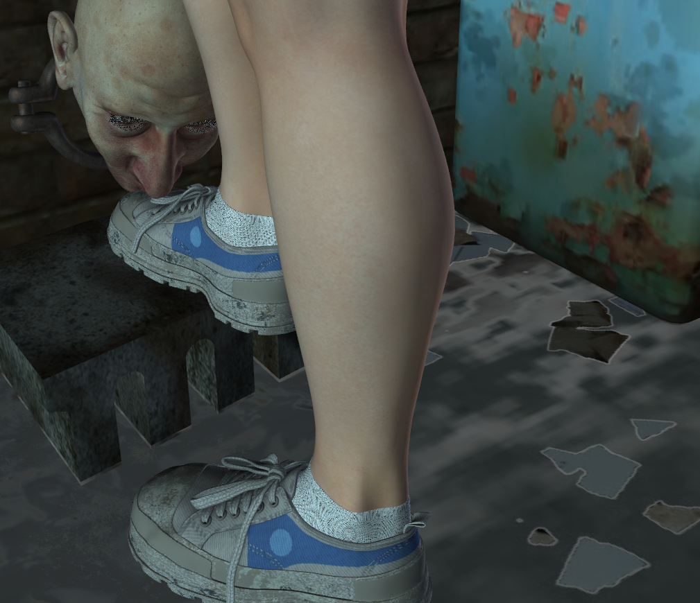 | He longingly looks at the dirt his menial mouth was unable to reach - on the very soles of her shoes! |